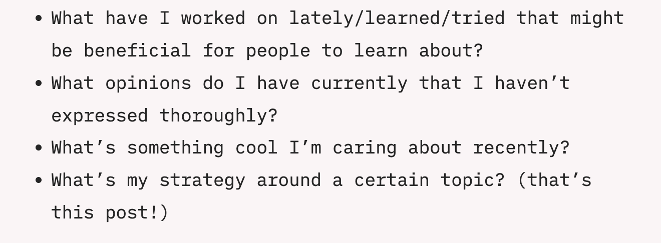 I recently came across Cassidy Williams’s blog, where she’s writing a post every day in December. I found her simple list for generating blog post topics useful: