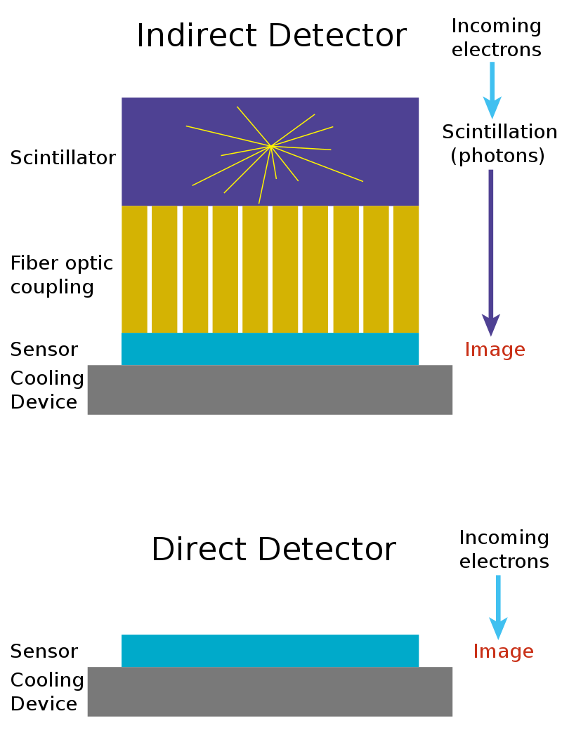 The stagnation in resolution was now due to the efficiency of the camera detectors. CCD and CMOS sensors were originally designed to detect light, not electrons. Light, in the form of photons, is converted into electrical charge and read by the sensor. Electrons, however, are not light. To overcome this limitation, scientists added a scintillator in front of the detector, which is a layer that converts incoming electrons into photons, which are then detected by the camera. But when electrons strike the scintillator, the emitted photons scatter in all directions, blurring the image and reducing resolution.