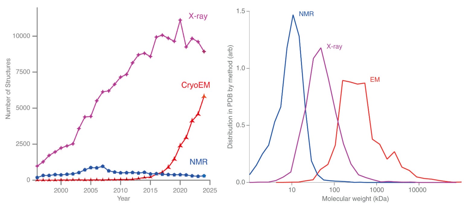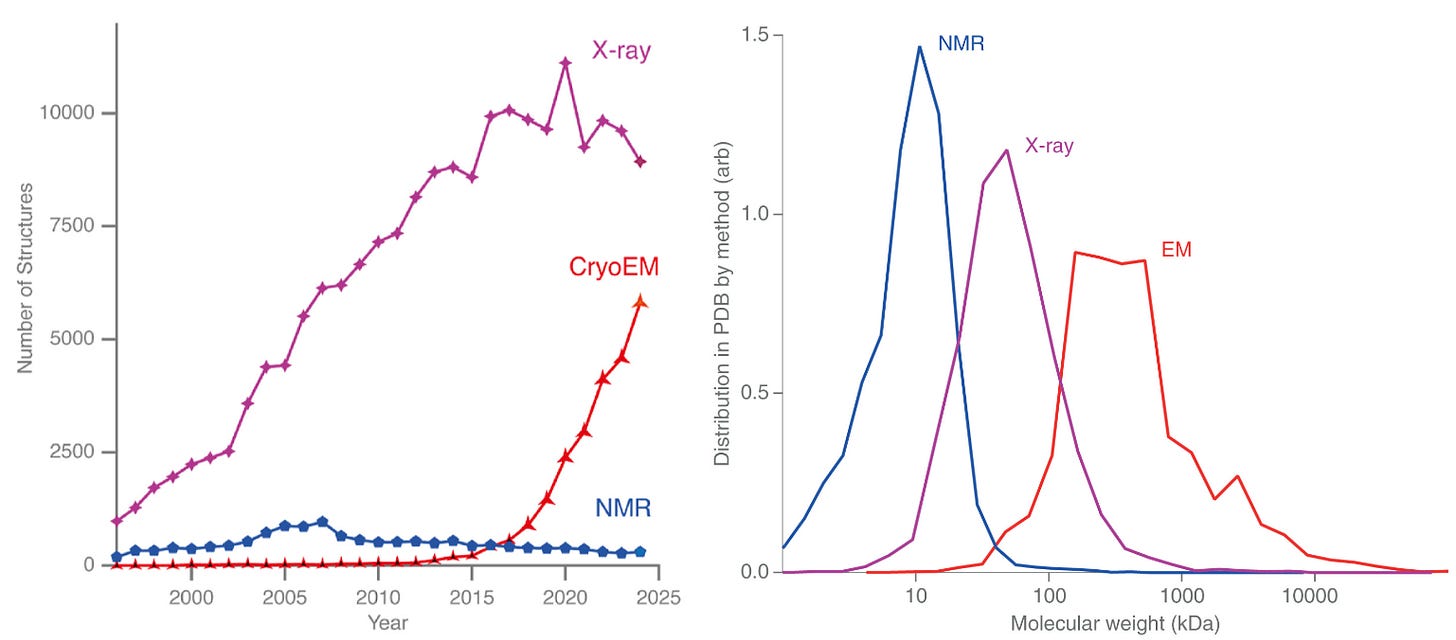 For decades, most structures deposited in the PDB came from X-ray crystallography. That balance is now shifting. Over the past ten years, the number of structures solved by cryo-EM has risen sharply, while X-ray crystallography is starting to plateau. If current trends continue, 2025 may mark a symbolic crossover point, where cryo-EM and X-ray crystallography reach equal footing in the number of structures deposited this year in the PDB, and from there, cryo-EM might begin to dominate.