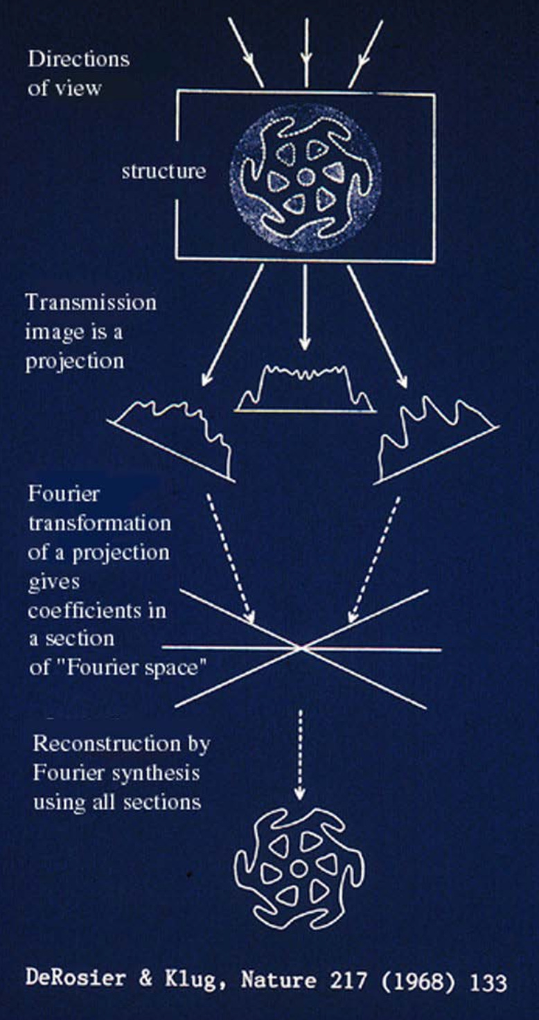 “In parallel, computational techniques were improving. Beginning in the 1970s, Joachim Frank developed statistical methods for aligning and averaging thousands of noisy electron micrographs of individual macromolecules. This “single-particle analysis” transformed faint, low-contrast images into coherent 3D reconstructions. When combined with Dubochet’s vitrification method, the two advances gave rise to single-particle cryo-electron microscopy: Molecules suspended in vitreous ice could be imaged in random orientations and computationally combined into detailed three-dimensional structures.”