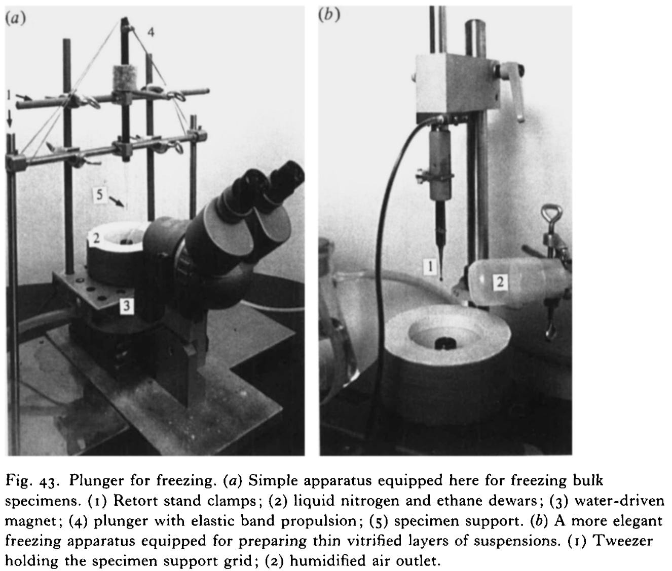 “For instance, from the start, electron microscopy for biology faced a water problem. Because the microscope operates under high vacuum, liquid water evaporates instantly, leaving delicate biological samples collapsed or distorted. To avoid this, aqueous samples had to be dried, fixed, or stained, which produced recognizable images but with obvious artifacts, such as shrunken cells, ruptured membranes, and structural distortions that no longer reflected the living state. Through the 1940s and 1950s, embedding samples in resins and the use of ultra-thin sectioning made cellular ultrastructure visible, while freeze-drying and early cryogenic sectioning offered partial preservation of hydrated material, though the results were still plagued by distortion.”